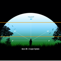 Le son immersif Auro-3D® part d'un constat assez simple : dans la nature, la majorité des sons et leurs réflexions les plus importantes ne proviennent pas directement du haut, mais nous entourent plutôt 360° (tout autour de nous). Par ailleurs, la forme et la position des oreilles implique un angle de perception optimal des sons compris entre 30 et 40° environ en dessous et au-dessus de l'axe horizontal. Le schéma ci-dessous illustre les différents niveaux de perception perçu par l’oreille humaine et pour lesquels le concept de son immersif Auro-3D® se traduit par la mise en place de trois couches d'enceintes.