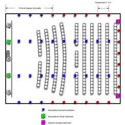 Il est important de préciser que pour mettre en place l’une de ces différentes configurations Auro-3D Max®, qu’il faut ajouter pour renforcer l’immersion sonore par l’objet des enceintes Wide entre l’écran et le premier rang de siège ainsi qu’un nombre d’enceintes Surround latérales accrue en fonction du nombre de rangs de la salle. Les configurations sont calculées et optimisées lors de la phase d’étude de la salle par l’un des bureaux d’études certifiés comme CINEDESIGNS.